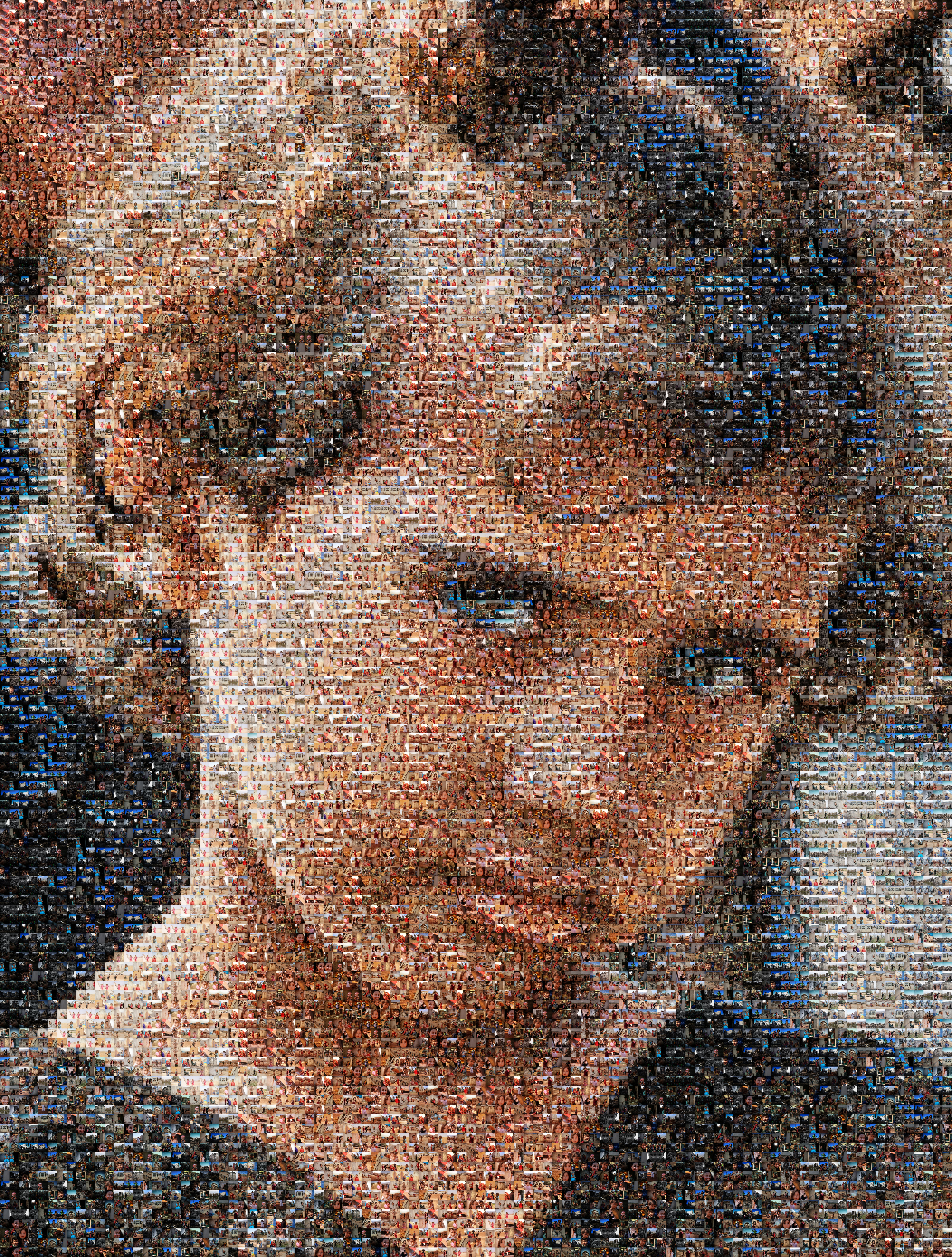 A child's portrait mosaic filled with tiles of children who are living in a challenging world.